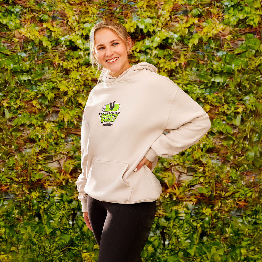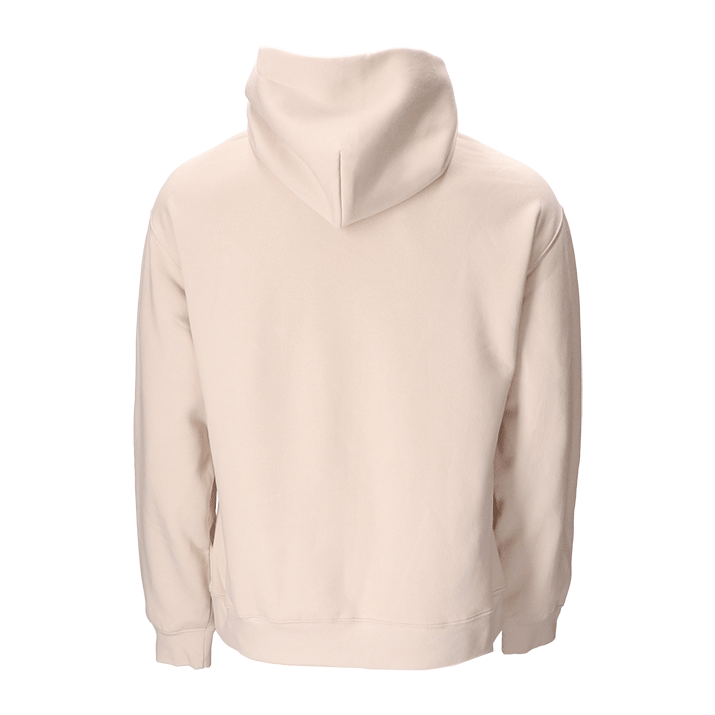 Features include a pullover style, drop shoulder, kangaroo pocket, and ribbed sleeve cuffs, complemented by a self-fabric lined hood.